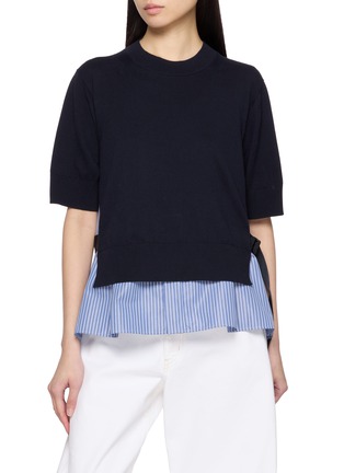A refined interplay of structure and softness, this half-sleeve knit top pairs a clean cotton jersey front with a crisp striped poplin peplum back. The cinched waist detail adds architectural volume, offering a quietly expressive silhouette that transitions effortlessly from day to evening.