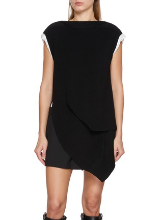 This sacai dress redefines modern elegance with its bold, asymmetrical design and draped details. The contrasting black and white fabric creates a striking visual effect, embodying the brand’s signature fusion of avant-garde style and wearable sophistication.