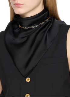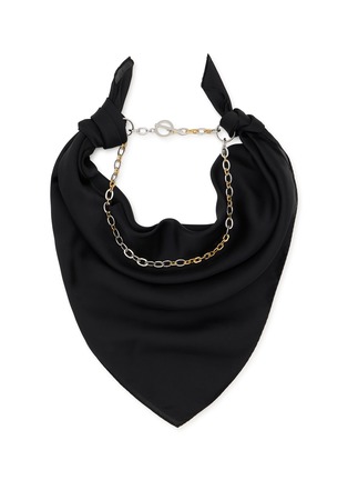 Sacai reimagines the classic bandana as a sculptural neck accessory, featuring knotted corners connected by mixed-metal chain links and a toggle closure. The draped silhouette merges soft textile with bold hardware detailing. A distinctive hybrid piece that showcases the brand's innovative approach to blending categories.