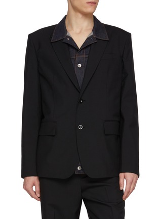 Tailored with sacai’s signature hybridity, this blazer fuses sharp poly-wool suiting with an unexpected denim underlayer. The clean single-breasted front conceals textural contrast beneath, creating a composed silhouette that reveals depth through movement—ideal for redefining formal dressing with a contemporary edge.