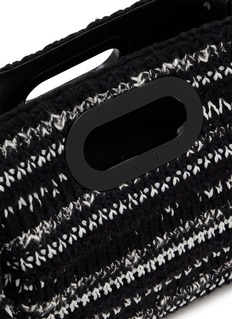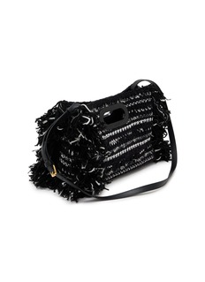 Sacai’s iconic shopper reimagined in a vibrant multicolor knit, elevated with delicate fringe details for artful texture. Featuring an intarsia logo woven on both front and back, it comes with a removable leather shoulder strap for versatile styling, a single spacious open interior, and polished oval metal handles for elegant hand carry—where Japanese avant-garde design meets everyday luxury.