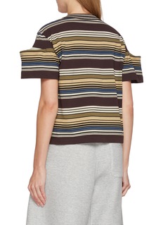 This piece features structural sleeves, creating structural tension and a bold silhouette. The striped knit texture adds visual depth and dimension, while the classic crew neck ensures timeless versatility. Pair with a loose-fitting skirt to balance the volume, achieving a look that’s both playful and effortlessly relaxed.
