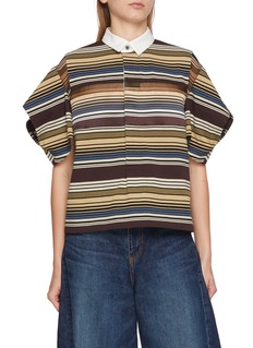 This piece features structural sleeves, creating structural tension and a bold silhouette. The striped texture adds visual depth and dimension, while the classic collar ensures timeless versatility. Pair with a loose-fitting skirt to balance the volume, achieving a look that’s both playful and effortlessly relaxed.