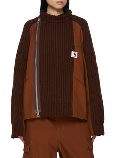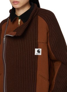 sacai's collaboration with Carhartt WIP redefines utilitarian style, merging the rugged functionality of Carhartt's iconic duck fabric jackets with sacai’s innovative design elements. Boasting a hybrid design with contrasting fabric, this jacket exudes an avant-garde take on winter essentials.