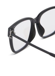 Discover the sophisticated allure of Saint Laurent's eyewear collection with these elegant black optical glasses. Featuring a bold rectangular frame and detailed with the delicate YSL logo on the hinges, these glasses merge timeless design with a modern edge. Perfect for fashion-forward individuals seeking to add a touch of luxury to their everyday style, these glasses are not only a statement piece but also ensure comfort and durability for daily wear. Ideal for enhancing your professional or casual looks with an understated yet chic accessory.