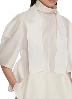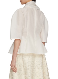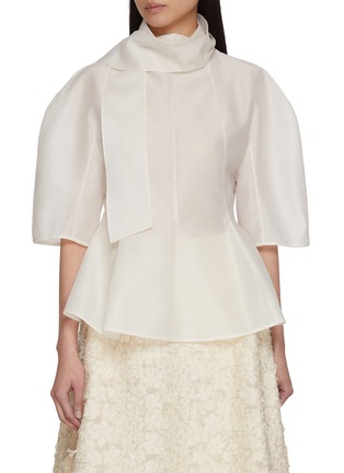 This exquisite ivory blouse from Lane Crawford is a testament to timeless elegance and modern design. Its structured silhouette is accentuated by a high, draped collar and dramatic bell sleeves, adding a touch of sophistication. The blouse is crafted from a luxurious, smooth fabric that gracefully flows to enhance its peplum style, creating a flattering shape that cinches at the waist before flaring out delicately.