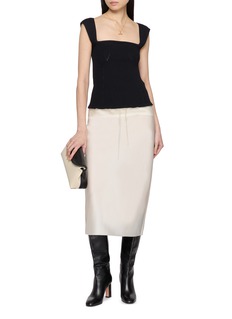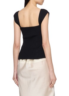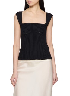 Sculpted with quiet confidence, this ribbed knit top by SANDBEIGE traces the body with fluid precision, framed by a softly squared neckline and delicate pointelle detailing. Elegant yet understated, it transitions effortlessly from refined daytime looks to evening pairings with silk skirts or tailored trousers.