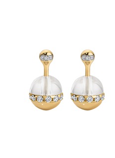 These 18K gold drop earrings feature a sliding rock crystal hemisphere that magnifies hidden ruby, tsavorite garnet, and blue, orange, and purple sapphires. The lower gold dome is bordered by a rim of diamonds to add a dazzling allure.