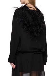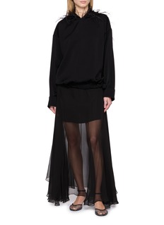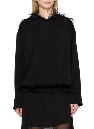 Sharon Wauchob subverts the familiar hoodie with couture nuance. Cut in fluid black polyester, this long-sleeve design is crowned with feather-trim detailing along the hood and shoulders, lending softness and tension to its minimalist form—ideal for evening layering with an avant-garde edge.