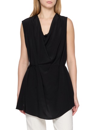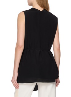This Sharon Wauchob sleeveless top embodies a sophisticated blend of elegance and modern design. Crafted in classic black, it features an artfully draped cowl neck that adds a touch of refined drama to the silhouette. The cinched waist with a tie detail enhances the figure while providing adjustable comfort, and the flowing hemline adds a graceful movement.