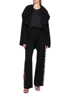 A study in controlled contrast, these Foster pants reveal Sharon Wauchob’s subversive elegance through sheer lace panels tracing the legs. Precision-cut and elongated in line, they transition effortlessly from sharp evening tailoring to directional daywear.