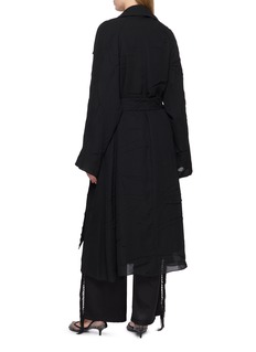 A trench reimagined with Sharon Wauchob’s signature sense of fragility and strength. Crafted in sheer, lightweight layers, this flowing silhouette drapes softly over the body, cinched with a self-tie belt to create movement and quiet drama—ideal for transitional evenings and refined layering.