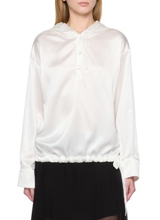 An iconic Sharon Wauchob silhouette rendered in fluid satin, this hooded top balances softness with intention. A relaxed drape is offset by a subtle button placket and elasticated hem, creating gentle volume—perfect for pairing with sheer skirts or tailored trousers alike.