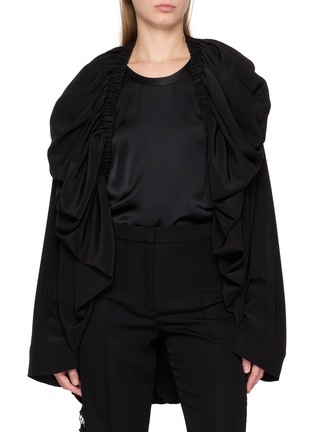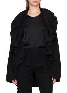 A sculptural blouson shaped by Sharon Wauchob’s signature draping, where gathered folds create a soft bubble effect across the shoulders and back. Finished with a tie waist, it balances volume and control—layered over tailored separates for an expressive yet restrained silhouette.
