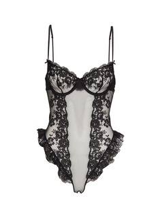 Elevated and bold. This corset features delicate sheer tulle and feminine bow detailing. Complete with ruffled trims, adjustable straps, and a bold backless design.