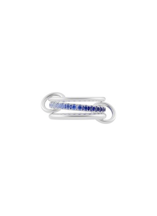 The Petunia features a central band of either blue sapphires, framed by two solid bands of sterling silver. Two orbiting connectors link each band to create a sculptural piece that's perfect for everyday wear.
