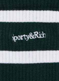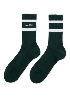 Elevate your sock drawer with these Brunello Cucinelli socks, crafted from a sumptuous blend of fabrics for utmost comfort and durability. The deep forest green hue is elegantly accented with classic white stripes, lending a sporty yet sophisticated aesthetic.
