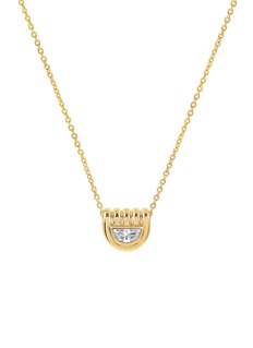 The Marmara Pendant captures pure energy in gold. A gleaming half-moon diamond rests within its smooth, sculptural form, inspired by the ancient Sea of Marmara. Suspended on a gentle cable chain, it sits with effortless ease at the collarbone—a symbol of dynamic elegance, where history’s flow meets modern grace.