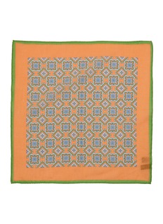 This StefanoBigi Milano pocket square is a masterpiece of design and craftsmanship. Artfully made in Italy, it features a vibrant, intricate mandala-like pattern in shades of blue and green, set against a warm orange background. The bold green border adds a striking contrast, enhancing the overall appeal. Crafted from fine cotton, this accessory promises both style and comfort, perfect for adding a splash of color and personality to any tailored look. Ideal for those who appreciate eye-catching accessories that make a statement.