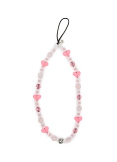 Add a touch of playful elegance to your mobile accessory collection with the String Ting Beaded Phone Wristlet. This delightful piece features an array of soft pink and shimmering beads, punctuated by adorable heart-shaped accents and a quirky skull bead for an unexpected twist. Crafted to provide both style and practicality, this wristlet keeps your phone secure and adds a pop of color and personality to your everyday carry.