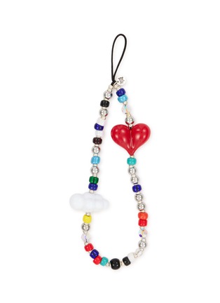 String Ting's eclectic phone strap features a hand-strung kaleidoscope of glass beads in varied shapes and sizes, punctuated by a sculptural lucite heart charm and lustrous metallic accents. The playful design celebrates individuality through its vibrant mix of cube, round, and faceted beads with branded detailing. A joyful Y2K accessory that transforms everyday tech into wearable art.