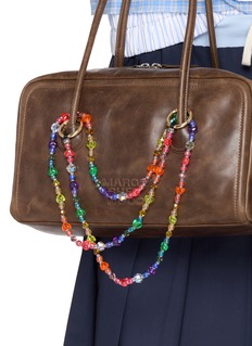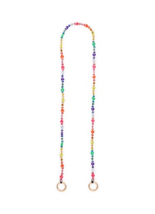 String Ting's rainbow-spectrum phone strap showcases hand-strung lucite heart charms alternating with faceted glass beads in a full gradient, secured by polished metal ring clasps. The artisanal design flows through the entire color wheel with iridescent crystal accents. A joyful celebration of love and individuality with nostalgic Y2K charm and dual-ended versatility.