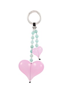 String Ting's whimsical bag charm features sculptural heart pendants suspended from a hand-beaded strand of semi-precious stone and lustrous pearl accents. The playful graduated hearts dangle from a polished metal ring with spring-gate clasp. An artisanal accessory that brings joyful, handcrafted charm to bags and keys alike.