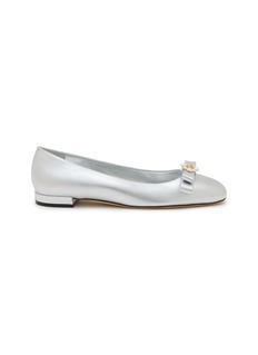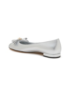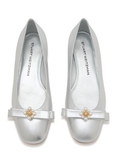 Stuart Weitzman infuses a timeless ballerina silhouette with a luminous metallic sheen, balancing modern radiance with classic femininity. Finished with a sculpted bow and pearl-like ornament, this flat offers an elegant, effortless shine suited for both everyday refinement and dressed-up moments.