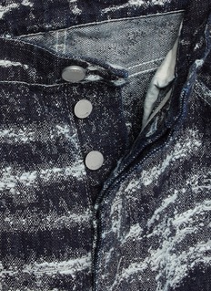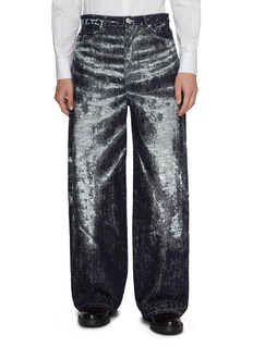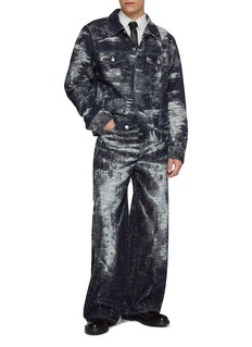 Marked by a painterly fade across deep indigo, these jeans express TAAKK’s fascination with time-worn surfaces and controlled imperfection. The straight, relaxed silhouette grounds the expressive finish, pairing effortlessly with crisp shirting or layered knits for modern everyday dressing.