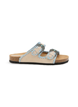 TAJI's artisan-crafted sandals showcase intricate whipstitch detailing and ornate hardware for a bohemian-luxe aesthetic. The dual-strap design features scalloped edges and decorative embellishments, while the contoured footbed ensures day-long comfort. A statement piece that brings handcrafted charm to contemporary wardrobes.