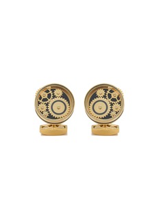 Step into a world of refined craftsmanship with Tateossian's Cufflinks. These luxurious cufflinks showcase a mesmerizing array of gold and black gears, encapsulated within a polished golden frame. The sophisticated design and mechanical beauty of these cufflinks make them a perfect accessory for distinguished occasions, offering a blend of traditional elegance and modern innovation.