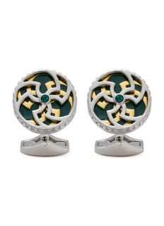 Discover the elegance of Tateossian's Cufflinks, where precision meets luxury. These stunning cufflinks feature a striking wheel design in silver and gold, centered by a radiant emerald-colored gem. The intricate detailing and contrasting colors provide a bold yet sophisticated look, perfect for enhancing any formal attire with a touch of brilliance and style.
