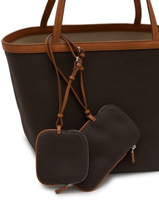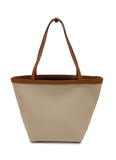The Row's Park Tote Three showcases a distinctive wide top that gracefully tapers to a narrower base, creating an elegant, trapezoidal silhouette that combines both form and function. This unique shape allows for ample storage space, making it an ideal choice for those who value both minimalist style and practicality in their accessories.