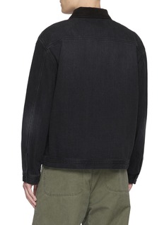 Introducing the Marcus Jacket from The Row, a minimalist masterpiece crafted from richly textured black denim. This jacket features a clean, fit that offers a modern interpretation of the classic denim jacket silhouette. The contrast corduroy collar lends a tactile finish, while the solid hue enhances its versatile appeal.
