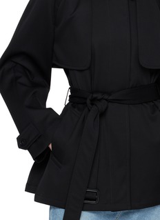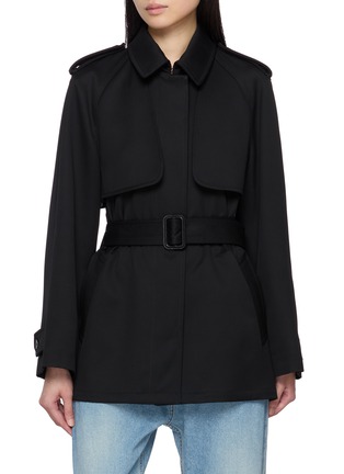 Cut from double-faced wool and cashmere gabardine, the Usuaia jacket reinterprets the trench through The Row’s sculptural restraint. A storm flap and epaulettes sharpen the silhouette. Finished with slant welt pockets and a buckled belt, it offers adaptable elegance across seasons.