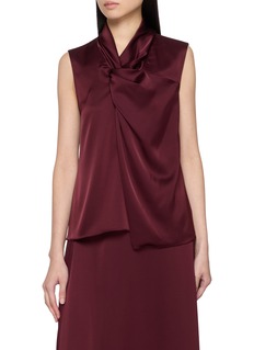 Sculptural drape defines this twisted split top, crafted from satin triacetate that falls with a refined, liquid gloss. The softly twisted neckline and asymmetric front cascade introduce modern elegance—perfect for pairing with sleek trousers or tonal evening skirts.