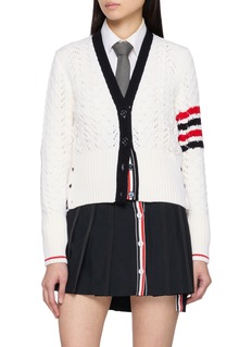 A study in contrast and craftsmanship, this cardigan blends airy pointelle stitches with Thom Browne’s unmistakable 4-bar stripe. Knitted from pure virgin wool, it offers warmth with a refined lightness, while grosgrain trims sharpen its uniform-inspired attitude—an elevated layer that moves seamlessly from weekday polish to weekend ease.