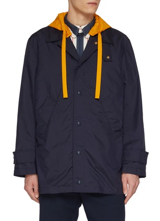 Thom Browne redefines sartorial rebellion, blending architectural tailoring with playful subversion. This jacket features a bold contrast hood and structured volume, creating a daring, modern silhouette.