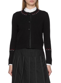 This cropped cardigan highlights Thom Browne’s refined knitwork through delicate star embroidery framing the neckline and cuffs. Crafted from ultrasoft cashmere with subtle stretch, it sits neatly above the waist—ideal for layering over crisp shirting or pairing with pleated skirts for a polished, feminine finish.