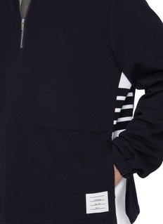 Anchored in Thom Browne’s uniform-driven codes, this pullover sweatshirt is crafted from smooth cotton jersey with a sculptural funnel neck and half-zip front. The colour-blocked side panel and signature 4-bar motif introduce graphic precision, lending structure to elevated off-duty styling.