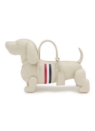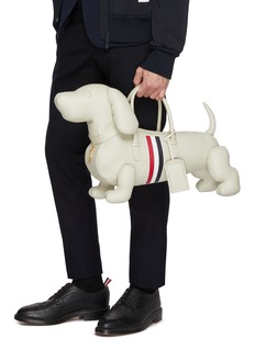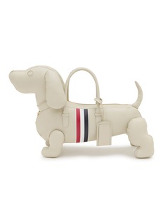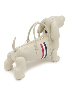 This whimsical hector tote epitomizes Thom Browne's playful sophistication with a three-dimensional sculptural silhouette and signature tricolour grosgrain stripe. The charming structured design features dual top handles and a zip closure, blending wit with impeccable craftsmanship. A conversation-starting collectible piece for fashion connoisseurs.