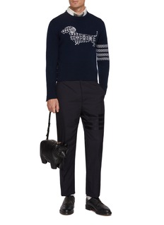 Crafted by Thom Browne, this merino wool sweater brings festive charm into sharp, disciplined knitwear. A Fair Isle–inspired Hector intarsia animates the front, while the patterned 4-bar sleeve and tricolour accents lend structure and signature detail—perfect for winter layering with personality and polish.