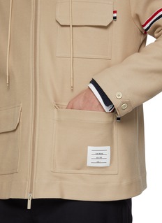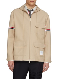 Embrace functionality and timeless style with this parka from Thom Browne, ideal for navigating any urban environment. Featuring a robust hood, secure zip fastening, and ample pocket space, this jacket is it ensures you stay warm without compromising on style.