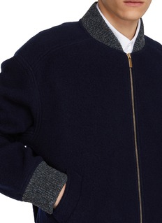 Thom Browne, where traditional tailoring meets modern aesthetics. Detailed with the label's iconic tri-colour stripe at the back, this bomber jacket is crafted from wool fleece to lend a plush feel to your athleisure looks.