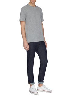 Echoing Thom Browne's seasonal lax proportions and explorations of fabrications, this relaxed piqué T-shirt seems to stray from the label's signature elements. Should you be disappointed, take a look at this piece's back and buttoned outseams, which are punctuated by tricolour stripes. Emphasise a branded preppy look by styling it with the zip hoodie sharing the same detail.
