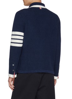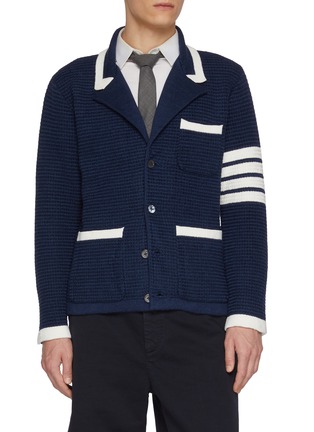 Refined through Thom Browne’s lens of modern uniform dressing, this cardigan is crafted with a textured touch. The iconic 4-bar stripe sharpens its collegiate character, ideal for layering over shirts or tailoring with understated confidence.