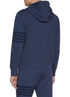 Rooted in Thom Browne’s understated approach to sportswear, this pullover hoodie is crafted from soft cotton jersey with a clean, architectural finish. The tonal 4-bar motif along the sleeve introduces quiet graphic definition, making it a refined layer for composed off-duty moments or travel-ready dressing.