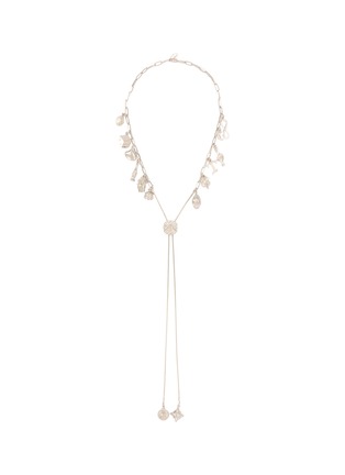 levate your accessory collection with the TOGA VIRILIS Metal Motif Loop Tie. This exquisite piece features a delicate silver-tone chain adorned with an array of playful and intricately designed charms, including whimsical figures and classic symbols. The central motif, a beautifully crafted medallion, anchors the piece, leading to slender, elegant drops that enhance its graceful allure. Perfect for adding a touch of whimsy and refined detail to any ensemble, this loop tie is a versatile must-have that blends artistry with functionality.