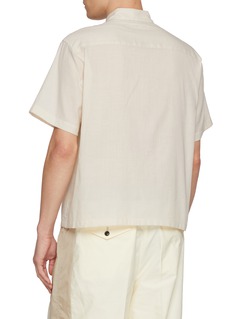 Light cotton-linen is cut into a clean, airy silhouette, punctuated by polished metal pin accents at the collar and chest. Distinctively expressive, this piece captures Toga Virilis’ fusion of tailored restraint and subversive detail—ideal for elevating summer tailoring or pared-back separates.