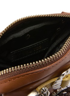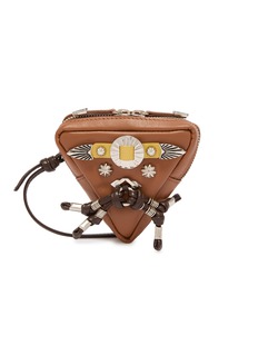 levate your accessory game with the TOGA VIRILIS Triangle Shoulder Pouch. This unique piece features a tan leather exterior adorned with eclectic metal and enamel embellishments, creating a striking visual contrast. The compact, triangular shape is both stylish and practical, perfect for carrying essentials. Finished with a slender, adjustable shoulder strap, this pouch blends functionality with TOGA VIRILIS's distinctive artistic vision, making it an ideal choice for those who seek to make a bold fashion statement.
